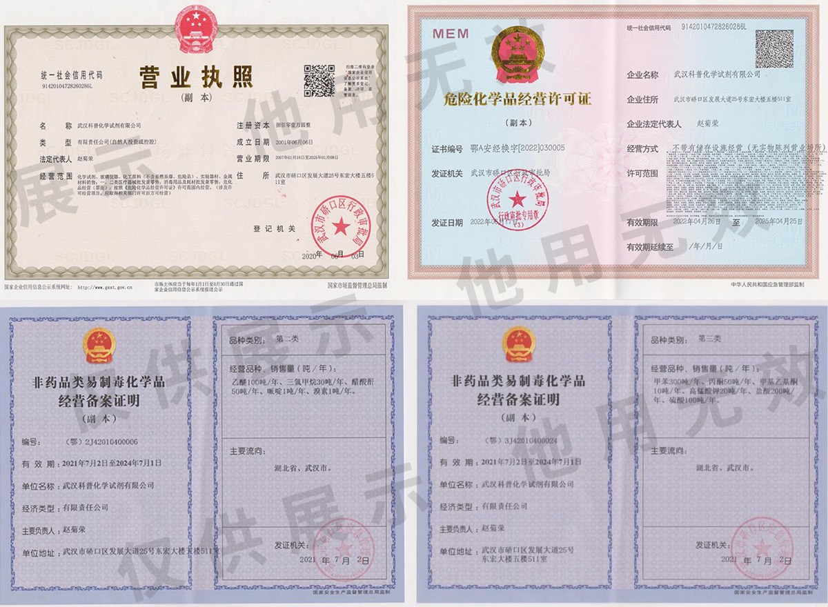 武汉科普化学试剂有限公司是一家立足于湖北、面向**以化学试剂、玻璃仪器、实验仪器、耗材为主营的专业实验室用品提供商。公司的主营产品在本区域内均处于行业前列地位。公司现有专业的供应链致力于为客户提供安全的产品及服务。公司主营:国产化学试剂,进口化学品,易制毒化学品,易制爆化学品,标准品,色谱耗材,电子化学品,培养基,玻璃制品,进口及国产仪器,水处理化学品及原料,**各类定制杂质。